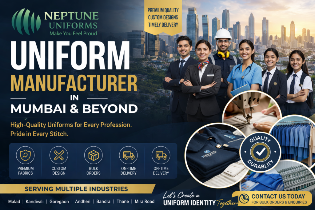 Neptune Uniforms is a trusted uniform manufacturer in Kandivali offering high-quality uniforms for schools, corporates, industries, and institutions. We provide customized designs, durable fabrics, and reliable bulk supply across Kandivali and nearby areas.